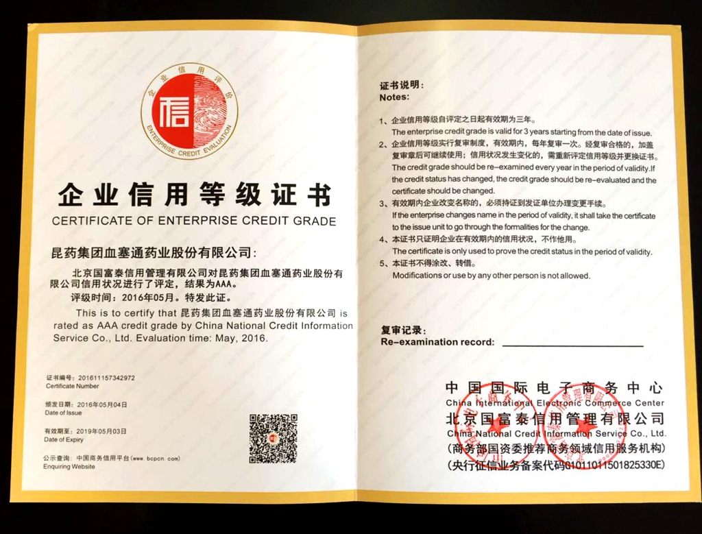 热烈祝贺昆药集团血塞通药业荣获商务部企业信用评级三A认证