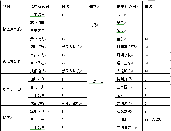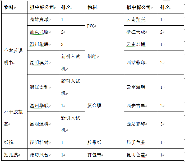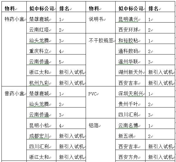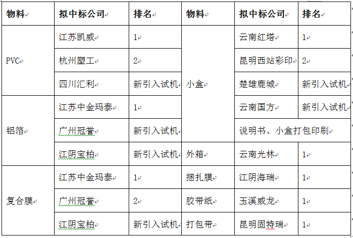 昆药集团2018年包材招标(招标编号:CG-2017-09)议标工作已经结束,拟中标名单如下: