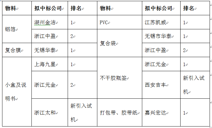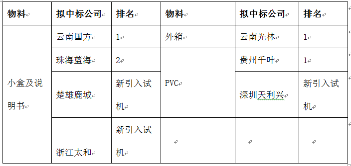 3、在新供应商试机期间,原供应商按照最终确认的报价继续供货,直至新增供应商试机合格后,按照报价排名执行分单比例。印刷类外包材试机请在3月31日前完成。