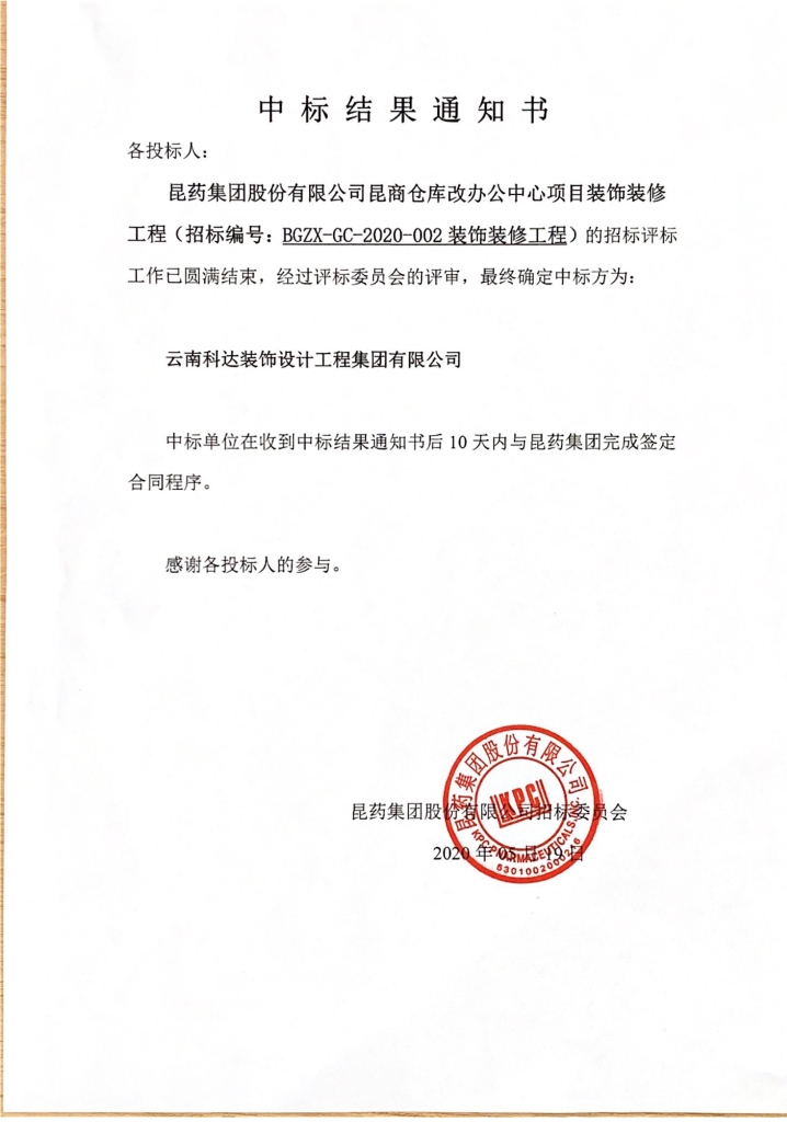 <span class="bdsharebuttonbox" data-tag="share_3" data-sharetitle="昆药集团股份有限公司昆商仓库改办公中心项目装饰装修工程中标公示"><a href="#" class="bds_sqq" data-cmd="sqq" title="分享到QQ好友"></a><a href="#" class="bds_weixin" data-cmd="weixin" title="分享到微信"></a><a href="#" class="bds_qzone" data-cmd="qzone" title="分享到QQ空间"></a><a href="#" class="bds_tsina" data-cmd="tsina" title="分享到新浪微博"></a><a href="#" class="bds_more" data-cmd="more"></a></span> 昆药集团股份有限公司昆商仓库改办公中心项目装饰装修工程中标公示 <span><i class="ico-1"></i>2020-05-21</span><span class="views"><i class="ico-1"></i><b id="viewCountId"></b></span><span id="switcher"> <a href="javascript:void(0)" id="big"><i class="ico-1"></i></a> <a href="javascript:void(0)"><i class="ico-1"></i></a> <a href="javascript:void(0)" id="small"><i class="ico-1"></i></a> </span> 上一条昆药生物医药科技园天然植物药创新基地化学合成原料药中试车间项目土建工程中标公示 下一条中标结果公示(昆药集团股份有限公司及子公司2023年度财产一切险及机器损坏险)