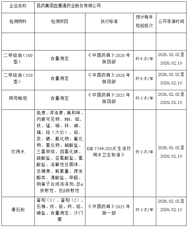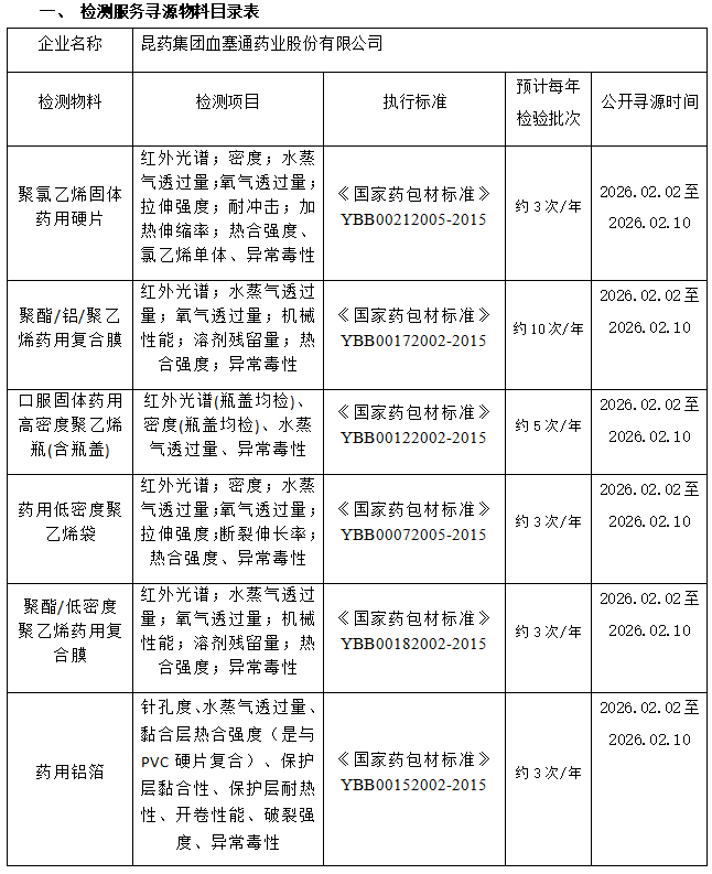 昆药集团血塞通药业股份有限公司物料检测服务公开寻源