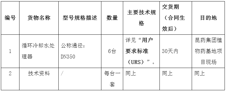 昆药集团植物药基地项目循环冷却水处理器设备采购招标公告
