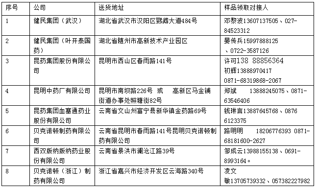 昆药集团(本部、昆中药、贝克诺顿、血塞通、版纳药业、贝克诺顿浙江6家公司),标书请寄:云南省昆明市西山区春雨路141号,许可138 88856364, 初辉13888970417,办公室