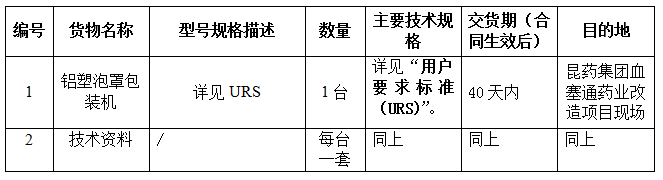 昆药集团股份有限公司就血塞通药业铝塑泡罩包装机设备采购(招标编号:XST-SB -2018-003)对外进行公开招标,按照“公开、公平、公正、科学、择优”的原则选择中标人,欢迎符合条件的投标人持相关资料前来报名,现就有关事项公告如下:
