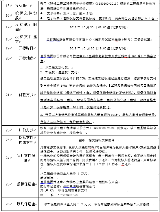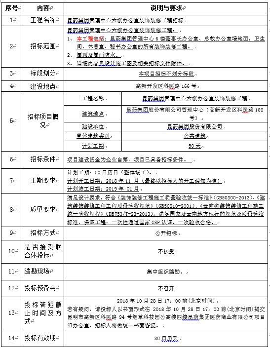 昆药集团管理中心六楼办公室 装饰装修工程施工招标