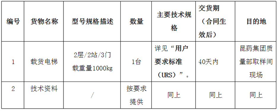 昆药集团质量部取样间载货电梯设备采购招标公告